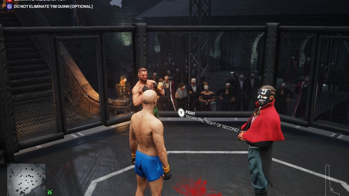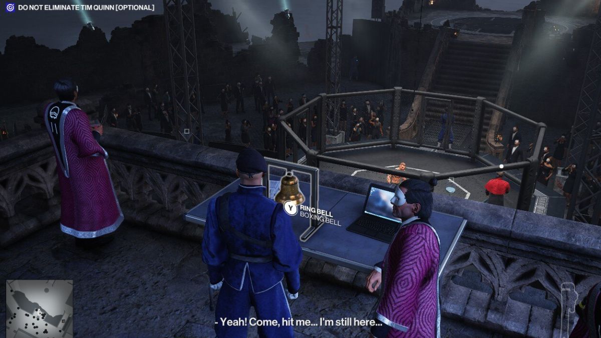 Внутри здания поговорите с генеральным директором Таймом Куинном, чтобы убедить его предоставить вам роль своего заместителя. Как только он согласится, помогите ему снять одежду, а затем оденьте Агента 47 в одежду для смешанных единоборств (ММА). После этой подготовки вернитесь на ринг, чтобы сразиться с Разрушителем.