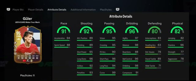 EA FC 24 Arda Guler Make Your Mark SBC имеет большую ценность, если принять во внимание возможности карты. С рейтингом 95 этот элемент CAM является универсальным и может эффективно выступать как в роли центрального полузащитника (CM), так и в качестве правого нападающего (RW), хотя его оптимальная позиция — в качестве CAM. Карта может похвастаться четырьмя впечатляющими стилями игры, среди которых выделяется «Технический».